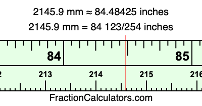 One millimeter is equal to 5/127 inches, and 2145.9 as a fraction is 21459/10. Therefore, to get the fractional answer to 2145.9 mm in inches, we multiply 21459/10 by 5/127 and simplify if necessary.