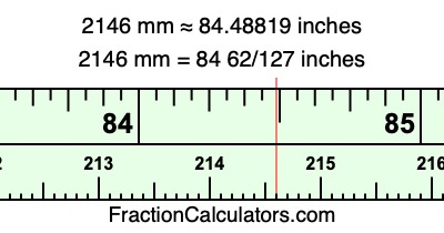 One millimeter is equal to 5/127 inches, and 2146 as a fraction is 2146/1. Therefore, to get the fractional answer to 2146 mm in inches, we multiply 2146/1 by 5/127 and simplify if necessary.