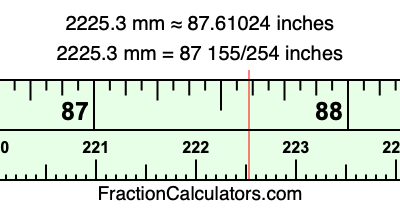 One millimeter is equal to 5/127 inches, and 2225.3 as a fraction is 22253/10. Therefore, to get the fractional answer to 2225.3 mm in inches, we multiply 22253/10 by 5/127 and simplify if necessary.