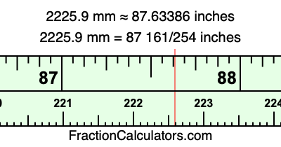 One millimeter is equal to 5/127 inches, and 2225.9 as a fraction is 22259/10. Therefore, to get the fractional answer to 2225.9 mm in inches, we multiply 22259/10 by 5/127 and simplify if necessary.