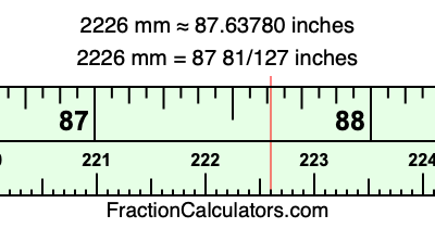 One millimeter is equal to 5/127 inches, and 2226 as a fraction is 2226/1. Therefore, to get the fractional answer to 2226 mm in inches, we multiply 2226/1 by 5/127 and simplify if necessary.