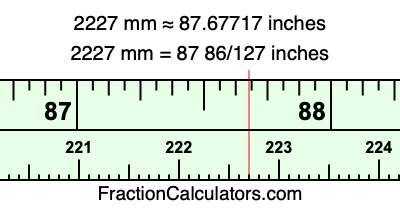 One millimeter is equal to 5/127 inches, and 2227 as a fraction is 2227/1. Therefore, to get the fractional answer to 2227 mm in inches, we multiply 2227/1 by 5/127 and simplify if necessary.