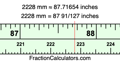 One millimeter is equal to 5/127 inches, and 2228 as a fraction is 2228/1. Therefore, to get the fractional answer to 2228 mm in inches, we multiply 2228/1 by 5/127 and simplify if necessary.