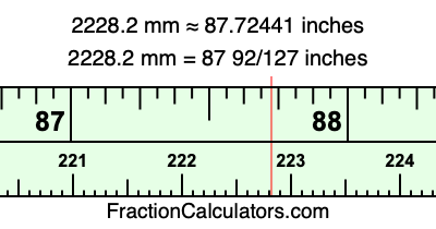 One millimeter is equal to 5/127 inches, and 2228.2 as a fraction is 11141/5. Therefore, to get the fractional answer to 2228.2 mm in inches, we multiply 11141/5 by 5/127 and simplify if necessary.