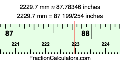 One millimeter is equal to 5/127 inches, and 2229.7 as a fraction is 22297/10. Therefore, to get the fractional answer to 2229.7 mm in inches, we multiply 22297/10 by 5/127 and simplify if necessary.
