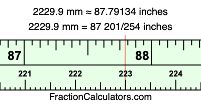 One millimeter is equal to 5/127 inches, and 2229.9 as a fraction is 22299/10. Therefore, to get the fractional answer to 2229.9 mm in inches, we multiply 22299/10 by 5/127 and simplify if necessary.