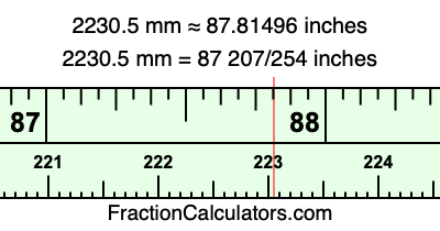 One millimeter is equal to 5/127 inches, and 2230.5 as a fraction is 4461/2. Therefore, to get the fractional answer to 2230.5 mm in inches, we multiply 4461/2 by 5/127 and simplify if necessary.