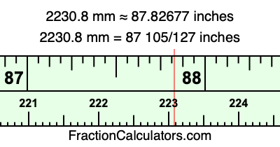 One millimeter is equal to 5/127 inches, and 2230.8 as a fraction is 11154/5. Therefore, to get the fractional answer to 2230.8 mm in inches, we multiply 11154/5 by 5/127 and simplify if necessary.
