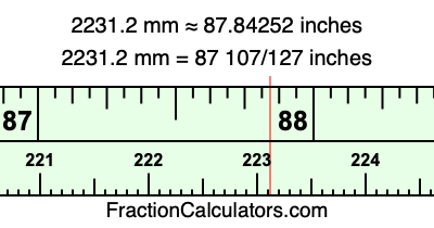 One millimeter is equal to 5/127 inches, and 2231.2 as a fraction is 11156/5. Therefore, to get the fractional answer to 2231.2 mm in inches, we multiply 11156/5 by 5/127 and simplify if necessary.