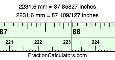 One millimeter is equal to 5/127 inches, and 2231.6 as a fraction is 11158/5. Therefore, to get the fractional answer to 2231.6 mm in inches, we multiply 11158/5 by 5/127 and simplify if necessary.