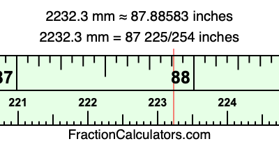 One millimeter is equal to 5/127 inches, and 2232.3 as a fraction is 22323/10. Therefore, to get the fractional answer to 2232.3 mm in inches, we multiply 22323/10 by 5/127 and simplify if necessary.