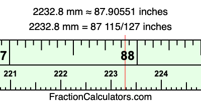 One millimeter is equal to 5/127 inches, and 2232.8 as a fraction is 11164/5. Therefore, to get the fractional answer to 2232.8 mm in inches, we multiply 11164/5 by 5/127 and simplify if necessary.