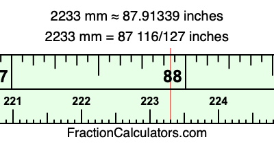 One millimeter is equal to 5/127 inches, and 2233 as a fraction is 2233/1. Therefore, to get the fractional answer to 2233 mm in inches, we multiply 2233/1 by 5/127 and simplify if necessary.
