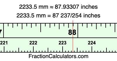 One millimeter is equal to 5/127 inches, and 2233.5 as a fraction is 4467/2. Therefore, to get the fractional answer to 2233.5 mm in inches, we multiply 4467/2 by 5/127 and simplify if necessary.