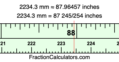 One millimeter is equal to 5/127 inches, and 2234.3 as a fraction is 22343/10. Therefore, to get the fractional answer to 2234.3 mm in inches, we multiply 22343/10 by 5/127 and simplify if necessary.