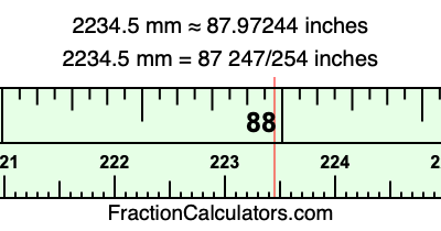 One millimeter is equal to 5/127 inches, and 2234.5 as a fraction is 4469/2. Therefore, to get the fractional answer to 2234.5 mm in inches, we multiply 4469/2 by 5/127 and simplify if necessary.