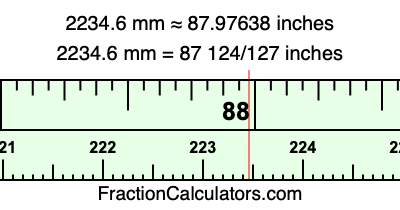 One millimeter is equal to 5/127 inches, and 2234.6 as a fraction is 11173/5. Therefore, to get the fractional answer to 2234.6 mm in inches, we multiply 11173/5 by 5/127 and simplify if necessary.