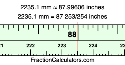 One millimeter is equal to 5/127 inches, and 2235.1 as a fraction is 22351/10. Therefore, to get the fractional answer to 2235.1 mm in inches, we multiply 22351/10 by 5/127 and simplify if necessary.