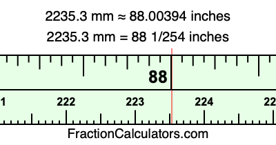 One millimeter is equal to 5/127 inches, and 2235.3 as a fraction is 22353/10. Therefore, to get the fractional answer to 2235.3 mm in inches, we multiply 22353/10 by 5/127 and simplify if necessary.