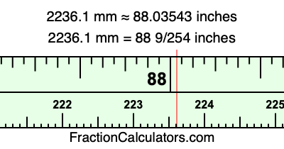 One millimeter is equal to 5/127 inches, and 2236.1 as a fraction is 22361/10. Therefore, to get the fractional answer to 2236.1 mm in inches, we multiply 22361/10 by 5/127 and simplify if necessary.