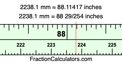 One millimeter is equal to 5/127 inches, and 2238.1 as a fraction is 22381/10. Therefore, to get the fractional answer to 2238.1 mm in inches, we multiply 22381/10 by 5/127 and simplify if necessary.