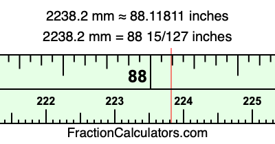 One millimeter is equal to 5/127 inches, and 2238.2 as a fraction is 11191/5. Therefore, to get the fractional answer to 2238.2 mm in inches, we multiply 11191/5 by 5/127 and simplify if necessary.