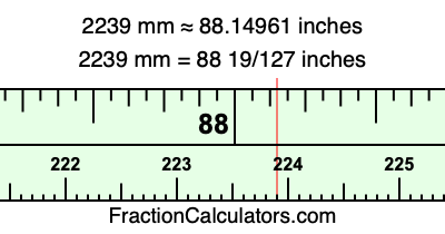 One millimeter is equal to 5/127 inches, and 2239 as a fraction is 2239/1. Therefore, to get the fractional answer to 2239 mm in inches, we multiply 2239/1 by 5/127 and simplify if necessary.