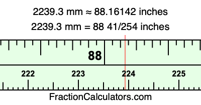 One millimeter is equal to 5/127 inches, and 2239.3 as a fraction is 22393/10. Therefore, to get the fractional answer to 2239.3 mm in inches, we multiply 22393/10 by 5/127 and simplify if necessary.