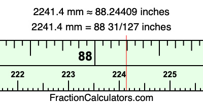 One millimeter is equal to 5/127 inches, and 2241.4 as a fraction is 11207/5. Therefore, to get the fractional answer to 2241.4 mm in inches, we multiply 11207/5 by 5/127 and simplify if necessary.
