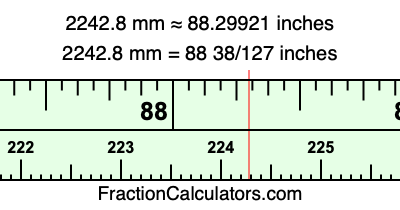 One millimeter is equal to 5/127 inches, and 2242.8 as a fraction is 11214/5. Therefore, to get the fractional answer to 2242.8 mm in inches, we multiply 11214/5 by 5/127 and simplify if necessary.