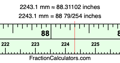 One millimeter is equal to 5/127 inches, and 2243.1 as a fraction is 22431/10. Therefore, to get the fractional answer to 2243.1 mm in inches, we multiply 22431/10 by 5/127 and simplify if necessary.