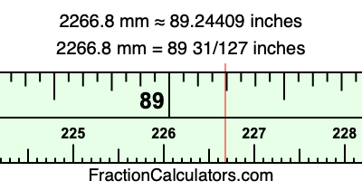 One millimeter is equal to 5/127 inches, and 2266.8 as a fraction is 11334/5. Therefore, to get the fractional answer to 2266.8 mm in inches, we multiply 11334/5 by 5/127 and simplify if necessary.