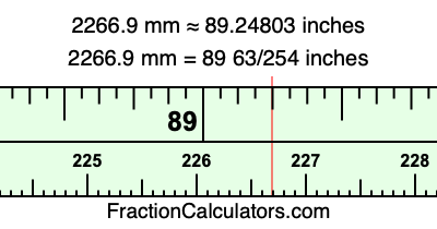 One millimeter is equal to 5/127 inches, and 2266.9 as a fraction is 22669/10. Therefore, to get the fractional answer to 2266.9 mm in inches, we multiply 22669/10 by 5/127 and simplify if necessary.