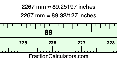 One millimeter is equal to 5/127 inches, and 2267 as a fraction is 2267/1. Therefore, to get the fractional answer to 2267 mm in inches, we multiply 2267/1 by 5/127 and simplify if necessary.