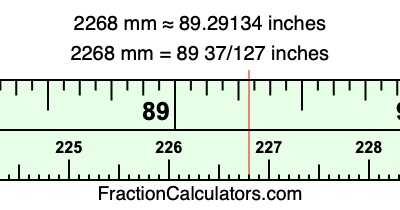 One millimeter is equal to 5/127 inches, and 2268 as a fraction is 2268/1. Therefore, to get the fractional answer to 2268 mm in inches, we multiply 2268/1 by 5/127 and simplify if necessary.