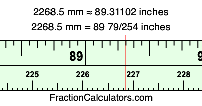 One millimeter is equal to 5/127 inches, and 2268.5 as a fraction is 4537/2. Therefore, to get the fractional answer to 2268.5 mm in inches, we multiply 4537/2 by 5/127 and simplify if necessary.