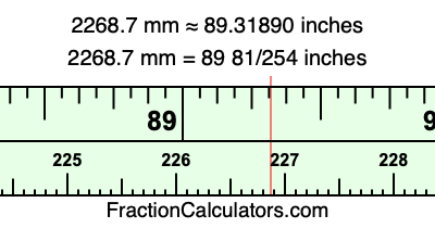 One millimeter is equal to 5/127 inches, and 2268.7 as a fraction is 22687/10. Therefore, to get the fractional answer to 2268.7 mm in inches, we multiply 22687/10 by 5/127 and simplify if necessary.