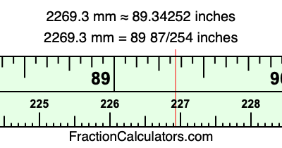 One millimeter is equal to 5/127 inches, and 2269.3 as a fraction is 22693/10. Therefore, to get the fractional answer to 2269.3 mm in inches, we multiply 22693/10 by 5/127 and simplify if necessary.