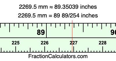 One millimeter is equal to 5/127 inches, and 2269.5 as a fraction is 4539/2. Therefore, to get the fractional answer to 2269.5 mm in inches, we multiply 4539/2 by 5/127 and simplify if necessary.