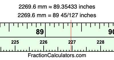 One millimeter is equal to 5/127 inches, and 2269.6 as a fraction is 11348/5. Therefore, to get the fractional answer to 2269.6 mm in inches, we multiply 11348/5 by 5/127 and simplify if necessary.