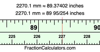 One millimeter is equal to 5/127 inches, and 2270.1 as a fraction is 22701/10. Therefore, to get the fractional answer to 2270.1 mm in inches, we multiply 22701/10 by 5/127 and simplify if necessary.