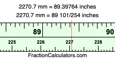 One millimeter is equal to 5/127 inches, and 2270.7 as a fraction is 22707/10. Therefore, to get the fractional answer to 2270.7 mm in inches, we multiply 22707/10 by 5/127 and simplify if necessary.