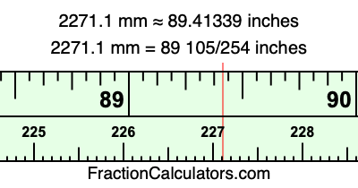 One millimeter is equal to 5/127 inches, and 2271.1 as a fraction is 22711/10. Therefore, to get the fractional answer to 2271.1 mm in inches, we multiply 22711/10 by 5/127 and simplify if necessary.