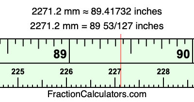 One millimeter is equal to 5/127 inches, and 2271.2 as a fraction is 11356/5. Therefore, to get the fractional answer to 2271.2 mm in inches, we multiply 11356/5 by 5/127 and simplify if necessary.