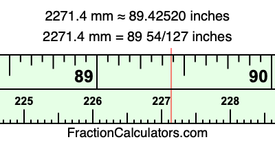 One millimeter is equal to 5/127 inches, and 2271.4 as a fraction is 11357/5. Therefore, to get the fractional answer to 2271.4 mm in inches, we multiply 11357/5 by 5/127 and simplify if necessary.