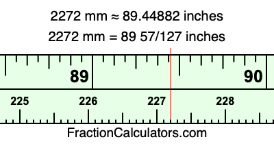 One millimeter is equal to 5/127 inches, and 2272 as a fraction is 2272/1. Therefore, to get the fractional answer to 2272 mm in inches, we multiply 2272/1 by 5/127 and simplify if necessary.
