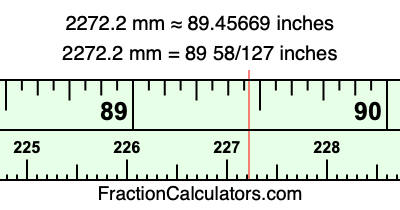 One millimeter is equal to 5/127 inches, and 2272.2 as a fraction is 11361/5. Therefore, to get the fractional answer to 2272.2 mm in inches, we multiply 11361/5 by 5/127 and simplify if necessary.