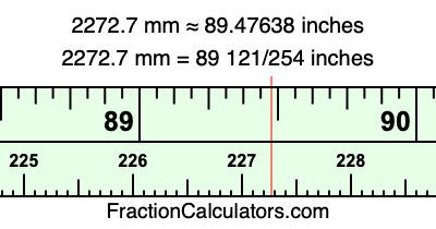One millimeter is equal to 5/127 inches, and 2272.7 as a fraction is 22727/10. Therefore, to get the fractional answer to 2272.7 mm in inches, we multiply 22727/10 by 5/127 and simplify if necessary.