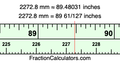 One millimeter is equal to 5/127 inches, and 2272.8 as a fraction is 11364/5. Therefore, to get the fractional answer to 2272.8 mm in inches, we multiply 11364/5 by 5/127 and simplify if necessary.