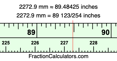 One millimeter is equal to 5/127 inches, and 2272.9 as a fraction is 22729/10. Therefore, to get the fractional answer to 2272.9 mm in inches, we multiply 22729/10 by 5/127 and simplify if necessary.